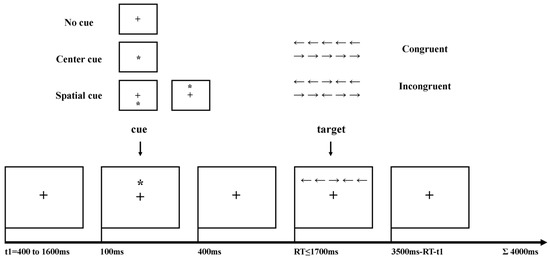 The experimental paradigm of the ANT was modified from Neuhaus [14], and the task design is displayed in Figure 1. The experiment was programmed in E-prime software. One fixation period (t1 = 400, 800, 1200, 1600 ms) was followed by an asterisk symbol warning cue occurring, including three cue conditions: no cue, center cue (at the fixation center of the screen), and spatial cue (above or below the fixation cross). Three types of cue conditions occurred proportionally with a duration of 100 ms. The target was an arrow flanked on both sides by two arrows either in the same direction (congruent condition) or in the opposite direction (incongruent condition), occurring with a maximum duration of 1700 ms after a 400 ms fixation period. Different trial types were pseudorandomized across three blocks of 96 trials so that each trial type had an equal probability of appearing before and after other specific trial. Subjects had to indicate the direction of the central arrow by left or right button press irrespective of flanker conditions. The RT of the subjects’ response was recorded in real time so that a variable fixation period (3500 ms–RT–t1) after target response assured the duration of each trial summing up to 4000 ms. Subjects were instructed to respond as quickly and accurately as possible during 96 trials of three blocks without any feedback. For better visual adaptability to the appearance of cue or target, the practice procedure was performed with a minimum of 24 trials along with feedback and EEG recording [14] with the help of the operator’s instruction [13]. The RT and response accuracy were recorded for each trial. Participants performed this task for almost 1 h or until they completed three blocks in total (288 trials). In addition, if the subjects were observed to have excess movements, the experiment would be stopped and the operator would instruct the subjects to relax for visual fatigue relief. Finally, due to a behavior label loss accident in one block, participants completed, on average 379 (98.70%) of the maximum 384 trials, ranging from 288 to 384.