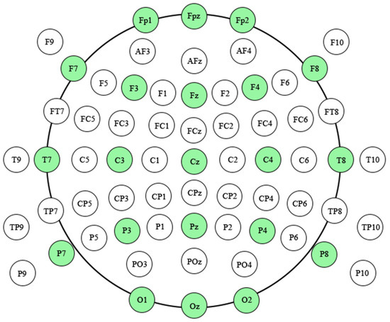 Figure 3. The horizontal distribution of scalp electrodes. The light green: canonical (21 out of 65) electrodes were used to construct the brain dynamic networks.