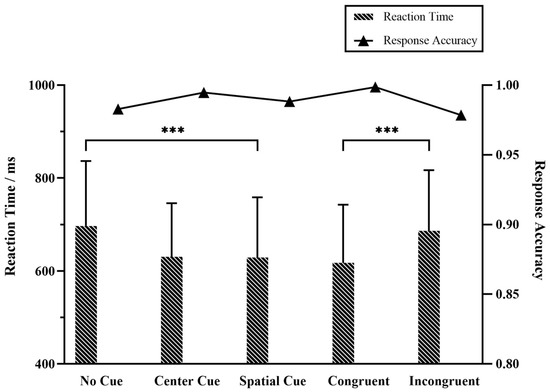 Figure 4. Behavioral main effects for reaction time and response accuracy during EEG recording. *** represented the significance p < 0.001 with repeated ANOVA test, and the error bars indicated the standard error of the mean.