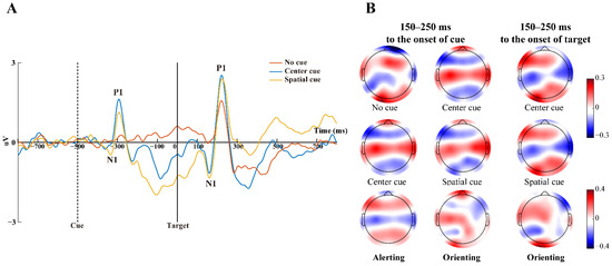 Figure 5. ERP waveforms and CSD topographical maps of each cue condition and two attention network effects: (A) grand average ERP waveforms stratified by cue and target conditions on electrodes POz, PO4, O1 and Oz. Cue stimulus onset is at −500 ms (dash line) and target stimulus onset is at 0 ms (solid line); (B) 2D top view of mean CSD maps of two attention network effects within 150–250 ms after cue and target onset. CSDs of alerting (bottom row) was obtained by subtracting averaged ERP of center cue condition (middle row) from no cue condition (top row), and orienting (bottom row) was obtained by subtracting averaged ERP of spatial cue (middle row) condition from center cue condition (top row). Units are μ V m 2 .