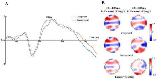 Figure 6. ERP waveforms and CSD topographical maps of 2 target conditions and executive control effect: (A) grand average ERP waveforms stratified by target conditions on electrodes Cz, C2, C4, CP2, CPz, CP4. Target stimulus onset is at 0 ms (solid line); (B) 2D top view of CSD maps of executive control effects within 300–500 ms after target onset (target-related P300). CSDs of executive control (bottom row) was obtained by subtracting averaged ERP of incongruent condition (middle row) from congruent condition (top row). Units are μ V m 2 .
