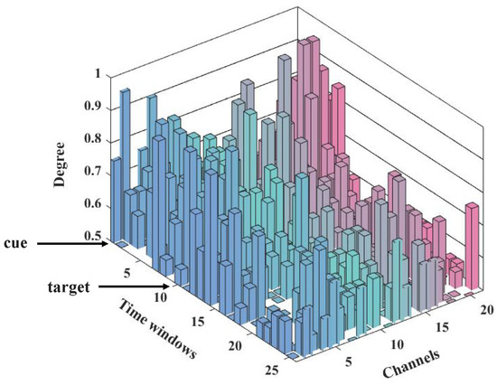 Moreover, in consideration that the small-world properties had been studied thoroughly [43], the degree analysis among those properties was selected due to its strength in evaluating the importance of the node in whole network [19,20], aiming at verifying the above post-target pattern changes of sparse information flow. The degrees of each channel in time windows were calculated by using the following equation [20]:
