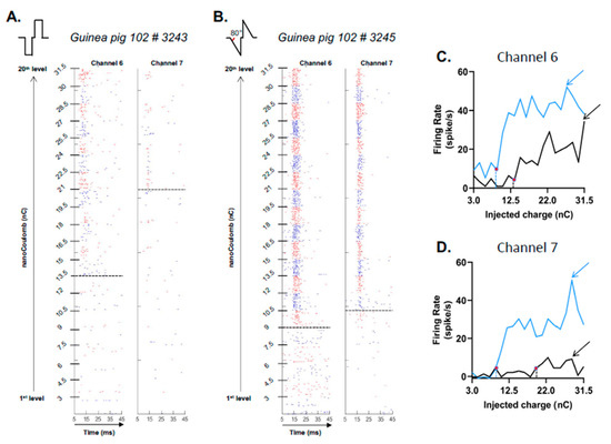 Individual examples of evoked firing rate and threshold of auditory cortex neurons with the rectangular cathodic pulses (A) and with one of the ramped pulse shape cathodic pulses (B). In (A,B), the rasters represent the raw evoked responses obtained in the auditory cortex for two simultaneous recordings (labeled channels 6 and 7) with increasing levels of charges from 3 to 31.5 nC (see the scale on the left side of each panel). In these rasters, each dot represents the occurrence of an action potential and each change from blue to red in the raster indicates an increase in charge level. The dashed lines indicate the threshold value obtained for each recording, i.e., the charge level triggering an evoked firing rate one standard deviation above spontaneous activity (see Methods for details). (A) Evoked responses obtained with rectangular cathodic pulses. (B) Evoked responses obtained with ramped cathodic pulses. Note the large increase in the number of action potentials triggered at each stimulation pulse when ramped pulses were used compared to rectangular pulses. (C,D) Quantification of evoked responses for the two channels displayed in (A,B). In both cases, the growth functions display the evoked firing rate (minus the spontaneous activity) as a function of the charge level obtained with rectangular pulses (black curve) and with the ramped pulses (blue curve). Both in (C,D) the red dots indicate the charge level considered as threshold and the arrows charge level where the maximal evoked firing rates was detected.