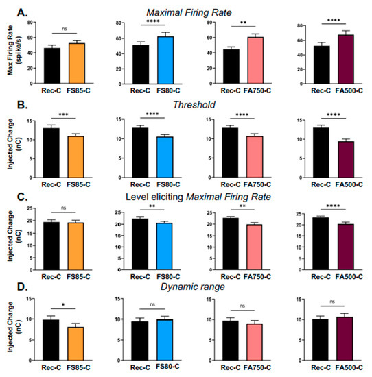Mean values (±sem) obtained for four parameters of evoked responses with the rectangular pulses and the four types of cathodic-first ramped pulses. For each parameter, statistical comparisons (Wilcoxon tests) were made between the set of recordings tested with the rectangular pulses and with a given shape of ramped pulses. (A) The maximal evoked firing rate (MaxFR) was increased when stimulations were performed with the four types of ramped pulses compared to rectangular pulses. This increase was significant for three types of ramped pulses (p < 0.01 with FS80-C, FA750-C and FA500-C), but did not reach significance with the FS85-C ramped pulses (p = 0.07). (B) The threshold was significantly decreased when stimulations were performed with the four types of ramped pulses compared to rectangular pulses (p < 0.01 in all cases). (C) The charge level at which the MaxFR was observed was decreased when stimulations were performed with the four types of ramped pulses compared to rectangular pulses. This decrease was significant for three types of ramped pulses (p < 0.01 with FS80-C, FA750-C and FA500-C), but did not reach significance with the FS85-C ramped pulses (p = 0.8278). (D) The dynamic range was not significantly modified when stimulations were performed with three types of ramped pulses compared to rectangular pulses (p = 0.40, p = 0.31 and p = 0.92 for the FS80-C, FA750-C and FA500-C, respectively). It was significantly decreased with the FS85-C (p < 0.05). See Table 1 for the mean values (±sem) and the p values. The number of recordings and the numbers of animals involved in each comparison are provided in Table 1. (* p < 0.05; ** p < 0.01; *** p < 0.005; **** p < 0.001; ns: not significant).
