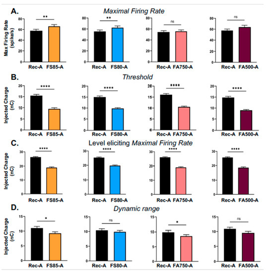 Strikingly, similar results were obtained with the anodic pulses (Figure 5). First, compared with the rectangular pulses, the MaxFR were increased (Figure 5A, but this was significant only with the FS85-A and FS80-A pulses). Second, the thresholds were systematically lower with the ramped pulses (Figure 5B) and so was the charge level providing the MaxFR (Figure 5C). Lastly, the dynamic range was also either unchanged or significantly decreased (Figure 5D). These effects were observed on all the animals.