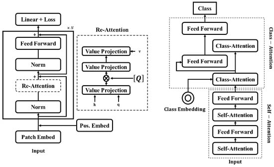 - Touvron, H.; Cord, M.; Sablayrolles, A.; Synnaeve, G.; Jégou, H. Going deeper with image transformers. In Proceedings of the Proceedings of the IEEE/CVF International Conference on Computer Vision, Montreal, QC, Canada, 10–17 October 2021; pp. 32–42. [Google Scholar]