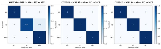 This finding implies that the nature of features extracted by attention layers in the vision transformer should differ from the features extracted by convolutional layers since the impact of sigma = 3, 4 in the previous studies was negligible [54,58]. Next, we calculated the confusion matrix of testing samples normalized per group for the best-performing OViTAD fMRI (test set 2), MRI-S3, and MRI-S4 (test sets 3) models in the multiple classification experiment to predict AD vs. HC vs. MCI, illustrated in Figure 3. The performance of the best-performing OViTAD models for the same test sets across 40 epochs is shown in Figure A4, Appendix A.