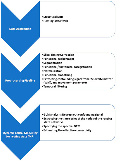 - Zeidman, P.; Jafarian, A.; Corbin, N.; Seghier, M.L.; Razi, A.; Price, C.J.; Friston, K.J. A guide to group effective connectivity analysis, part 1: First level analysis with DCM for fMRI. Neuroimage 2019, 200, 174–190. [Google Scholar] [CrossRef] [PubMed]
