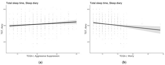 Subjective total sleep time as a function of (a) aggressive suppression and (b) worry strategies. The error bars represent 95% confidence intervals of the estimated means.