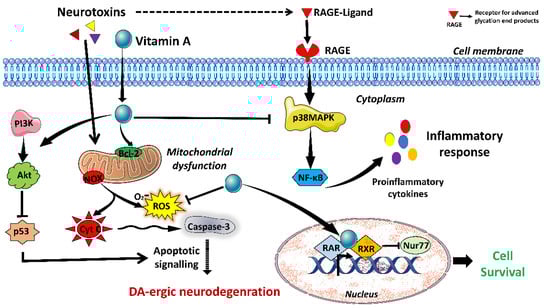 Possible neuroprotective mechanism of Vitamin A (Retinol) against Parkinson’s disease (PD). Retinoic acid (RA), the active form of vitamin A, has been shown to counter various PD-associated pathological changes. Following its entry inside the cell, retinoic acid activates PI3K/Akt signaling, which in turn inhibits the p53-mediated apoptotic process. RA also activates the antiapoptotic molecule Bcl-2. In addition, it inhibits receptor-advanced glycation-end receptor-advanced glycation-end (RAGE) products, key regulators of p38 mitogen-activated protein kinase/nuclear factor kappa B (p38MAPK/NF-κB) signaling mediated inflammatory response. Retinoic acid also exhibits reactive oxidative stress (ROS) scavenging ability as its presence decreases oxidative stress levels. Retinoic acid receptors, namely, retinoic acid receptor (RAR) and retinoid X receptor (RXR), located inside the nucleus, binds with retinoic acid to transcribe genes related to cell differentiation, and survival. RA enters inside the nucleus and binds to its receptors, inducing their transcription factor activity resulting in the expression of genes related to cell differentiation, and survival. RXR also modulates the export of Nur77 from the nucleus to the cytoplasm, resulting in the inhibition of Nur77-mediated apoptosis.