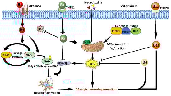 Possible neuroprotective mechanism of Vitamin B against Parkinson’s disease (PD). Genetic mutation in familial PD genes such as PTEN induced putative kinase 1 (PINK1), parkin, and DJ1 or environmental neurotoxins causes mitochondrial dysfunction resulting in reactive oxygen species (ROS) production. Increased ROS activates glycogen synthase (GSK-3β) followed by microglia activation-mediated neuroinflammation, which finally causes DA-ergic neurodegeneration. Vitamin B1 binds to its receptor THTR1 and enters inside the cell. It inhibits GSK-3β resulting in the inhibition of neuroinflammation. In addition, it inhibits p53 signaling and activates antiapoptotic Bcl-2 molecule resulting in the inhibition of apoptosis. Vitamin B3 enters the cell through its receptor GPR109A and increases biosynthesis of nicotinamide adenine dinucleotide (NAD) by salvage pathway. Additionally, it causes poly ADP ribosylation of NAD, which results in an anti-inflammatory response and thus, protection from DA-ergic neurodegeneration. Vitamin B6 also acts as a free radical scavenger molecule, decreases oxidative stress, and inhibits DA-ergic neurodegeneration. Vitamin B12 binds to its receptor CD320 and enters inside the cell. It acts as a free radical scavenger molecule, ameliorates oxidative stress, and inhibits DA-ergic neurodegeneration.