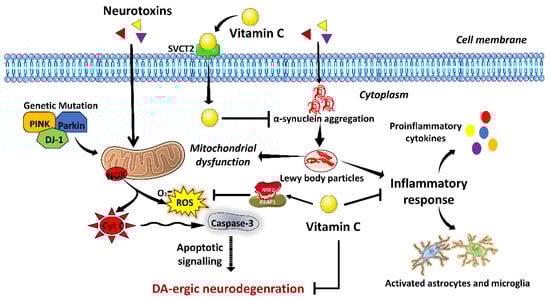 Vitamin C, also called ascorbic acid, is commonly found in citrus fruits such as oranges, lemons, and grapes and vegetables such as broccoli. It has antioxidant, anti-viral, anti-microbial, and anti-inflammatory properties []. Vitamin C plays a crucial role in the antioxidant system, neurotransmission modulation, synaptic potentiation, and myelination in the CNS []. Neurological disorders, such as atypical Parkinsonism, have a strong correlation with vitamin C deficiency. Clinical studies have shown that patients with IPD and vascular Parkinsonism are deficient in vitamin C [,]. A deficiency of vitamin C is directly associated with the risk of PD. PD patients have reduced levels of vitamin C in their plasma compared to control subjects, suggesting vitamin C is a potent biomarker for PD []. In line with this, some other studies have shown that dietary intake of antioxidants, including vitamin C, may reduce the risk of PD and slow the progression of Parkinsonian symptoms in older individuals [,,]. Further, supplementation of vitamin C has also been shown to reduce protein oxidation, suppress H2O2 production, and increase anti-oxidant enzymatic activity in the DJ-1β mutant fly model of PD []. Mechanistically, vitamin C becomes internalized in the cell via a transporter called sodium-dependent vitamin C transporter type 2 (SVCT2). Inside the cell, vitamin C induces activation of nuclear factor erythroid 2-related factor 2/kelch-like ECH-associated protein 1(NRF2/Keap1) signaling, resulting in increased levels of antioxidant enzymes, thus aiding in the amelioration of oxidative stress-mediated PD progression [,]. Moreover, a study on MPTP-induced mice model of PD highlights that vitamin C also suppresses neuroinflammatory responses related to microglia and astrocytes’ activation and modulates TLR/NF-κB/NLRP3/IL-1β pathway, thus ameliorating PD-associated neuroinflammation [,]. Another in vivo study has shown that vitamin C inhibits MPP+-induced oxidative stress, preventing DA-ergic neuronal loss in PD []. Vitamin C also inhibits LB formation in PD, inhibiting apoptotic signaling-mediated cell death []. These shreds of evidence suggest that vitamin C, an antioxidant and anti-inflammatory agent, could be a potential therapeutic and preventive strategy against DA-ergic neurodegeneration in PD. A brief overview of the possible mechanistic role of vitamin C in amelioration of PD associated pathophysiological changes have been illustrated in Figure 3.