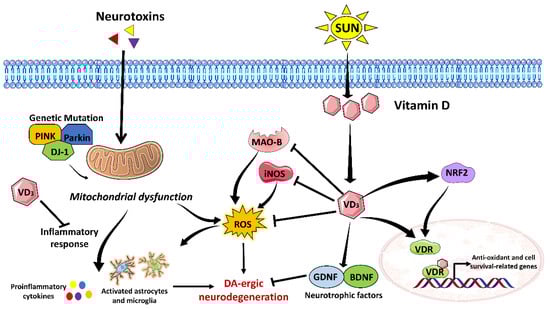 Dietary supplementation with vitamin D3, the biologically active form, has demonstrated remarkable therapeutic value in PD. Vitamin D3 has been shown to improve behavioral impairments, reduce oxidative stress, and mitigate the loss of DA-ergic neurons and DA depletion in various animal models of PD [,,]. In terms of molecular mechanism, it causes an increase in the expression of dopamine transporter and enzyme tyrosine hydroxylase. It suppresses ROS generation mediated by NADPH oxidase (NOX), MAO-B and inducible nitric oxide synthase (iNOS). Furthermore, vitamin D treatment reduces pro-inflammatory responses while activating anti-inflammatory responses, resulting in PD neuroprotection. Mechanistically, vitamin D3 decreases neuroinflammatory TNF-α, TLR-4, iNOS, CD11b, MAO-B, IL-I β, p47phox, and M1 microglia (pro-inflammatory) activation while promoting M2 microglia activation for an anti-inflammatory response. Moreover, vitamin D3 supplementation restores levels of brain-derived neurotrophic factor (BDNF) and glial-derived neurotrophic factor (GDNF) in the animal models of PD, thereby contributing to the survival of neurons []. GDNF binds to GDNF family receptor alpha 1 and then interacts with proto-oncogene tyrosine-protein kinase receptor Ret, forming a complex. This complex induces activation of intracellular signaling that confers neuronal survival []. GDNF, a powerful anti-oxidant, also stimulates the production of glutathione (GSH), SOD, and CAT in the striatum and aids in the regeneration of DA-ergic neurons []. Taken together, vitamin D holds immense antioxidant, anti-inflammatory, and neuroprotective potential in PD pathogenesis, which needs to be explored in more detail. Figure 4 depicts a brief overview of the probable molecular function of vitamin D in the amelioration of PD-related pathophysiological alterations.