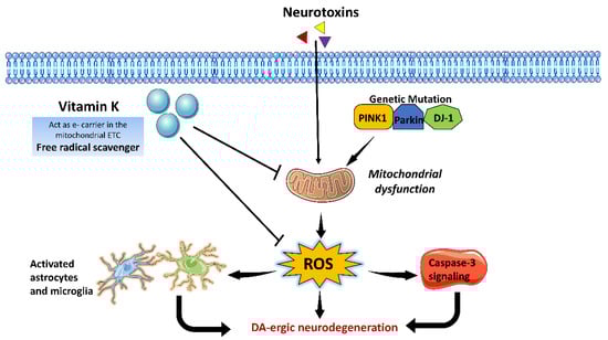 Vitamin K is a group of fat-soluble vitamins existing in two forms, viz., vitamin K1 and K2. Vitamin K is a cofactor in synthesizing sphingolipids, the vital parts of the neuronal membranes. Epidemiological studies determining the relationship between vitamin K and PD are scarce. A case-controlled study involving 93 PD patients and 95 control subjects revealed that deficiency of vitamin K2 is associated with PD progression. Thus, vitamin K2 could be a potential biomarker for diagnosing PD []. Vitamin K2 is a potential treatment for mitochondrial abnormalities, particularly in PD patients lacking PINK1 or parkin. Vitamin K2 is essential and sufficient for transporting electrons in drosophila mitochondria, leading to the repair of mitochondrial abnormalities using a PINK1 mutant model. Like ubiquinone, vitamin K2 has been shown to transport electrons, enabling drosophila mitochondria to produce adenosine triphosphate (ATP) efficiently. Vitamin K2 was even helpful in addressing systemic locomotion abnormalities in adult PINK1 and parkin mutant flies []. In light of this, vitamin K2 has been recommended as a potential therapy option for mitochondrial dysfunction, particularly in PD patients with a PINK1 or parkin deficit. It has also been shown that vitamin K reduced α-synuclein fibrillization at sub-stoichiometric dosages []. A study by Yu et al. revealed that menaquinone-4 (MK-4), a vitamin K2 homolog, suppresses microglial activation in rotenone-treated BV2 cells by restoring mitochondrial membrane potential, reducing ROS production, and inhibiting NF-κB activation. MK-4 also prevented microglial-induced neuronal cell death, thus demonstrating the inflammation regulatory role of vitamin K2 in PD pathogenesis []. Before establishing a causative relationship between vitamin K2 and the onset of PD, nevertheless, further information and in-depth analyses are required. A brief overview of the possible mechanistic role of vitamin K in ameliorating of PD-associated pathophysiological changes has been illustrated in Figure 6.