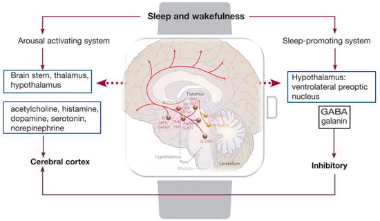 Several neurotransmitters are released during the sleep–wake cycle, such as catecholamines, serotonin, and acetylcholine. Moreover, several factors specifically influence the wakefulness, such as olfactory, visual, vestibular, and other neuromodulators. []. The reticular activating system (RAS) has been shown to be the arousal system maintaining consciousness. The RAS, after receiving the impulses from the spinal cord, conveys them to the thalamus and successively to the cerebral cortex []. Wakefulness is promoted by the basal forebrain, lateral hypothalamus, and tuberomammillary nucleus. In particular, the neurons in the basal forebrain containing acetylcholine promote arousal involvement of the cerebral cortex during the W phase of sleep, activating alertness [,]. Accordingly, lesions in this area with the neurotoxin hypocretin-2-saporin cause severe loss of sleep []. On the other hand, the lateral hypothalamus neurons are defined as a “wake switch” for the connections to several wake-promoting areas, such as to the adrenergic, histaminergic, dopaminergic, and cholinergic nuclei []. According to the studies of Constantine von Economo, the anterior hypothalamus is associated with sleep, whereas the posterior hypothalamus is correlated to awareness of the histaminergic neurons [,] that project into the cerebral cortex, the amygdala, and the substantia nigra, and receive input from the hypocretinergic neurons of the lateral hypothalamus and GABAergic neurons in the ventrolateral preoptic area [,]. The brainstem sends wake-promoting neurons from the rostral reticular formation to the forebrain, regulating the sleep–wake cycle. The neurons of the rostral pons that project into the dorsal thalamic nuclei via a dorsal pathway, fire rapidly during W and REM sleep, but decrease during SWS, and are called W-on/REM-on neurons. Another pathway is the ventral pathway that projects into the magnocellular neurons in the substantia innominata, medial septum, and the diagonal band [], actively firing during W and becoming inactive during SWS and REM sleep. As already reported, the wake phase is activated by various arousal systems that generate different neurochemicals [], such as histamine- [], glutamate [], noradrenaline (NA)- [,,], dopamine (DA)- [,], 5-hydroxytryptamine (5-HT)- [,], ACh- [], and hypocretin (HCRT)-containing neurons [,] (Figure 2).