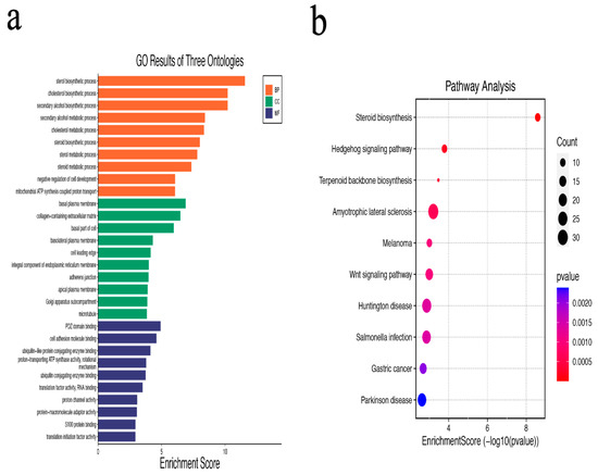 The GO analysis revealed that DEGs are primarily enriched in biological processes related to sterol, cholesterol, secondary alcohol, and other biological processes. DEGs are mainly associated with negative regulation of cell development, mitochondrial ATP synthesis-coupled proton transport and basal plasma membrane, and other related cell components. DEGs are mainly related to PDZ domain binding, cell adhesion molecule binding, ubiquitin-like protein conjugating enzyme binding, and other molecular functions (Figure 2a,b).Additionally, the KEGG pathway analysis revealed that DEGs are primarily involved in the pathways for steroid biosynthesis, hedgehog signaling, terpenoid backbone biosynthesis, amyotrophic lateral sclerosis, and melanoma (Table 1).
