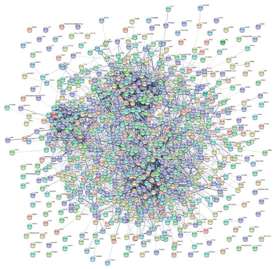 The PPIs of DEGs were analyzed, the gene data were integrated, and upregulated and downregulated genes were mapped via a PPI network diagram using the Search Tool for the Retrieval of Interacting Genes/Proteins (STRING) database (https://string-db.org/, accessed on 16 June 2022). Core genes were screened using Cytoscape (Ver 3.6, Beijing, China).