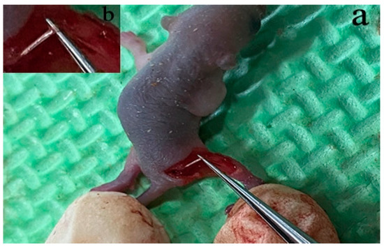 Locate the sciatic nerve of C57/BL6 (a) full image; (b) magnified image of the sciatic nerve.