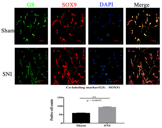 The co-labeling results of GS and Sox9 (Scale bar: 100 μm, 200×) (** p = 0.0035).