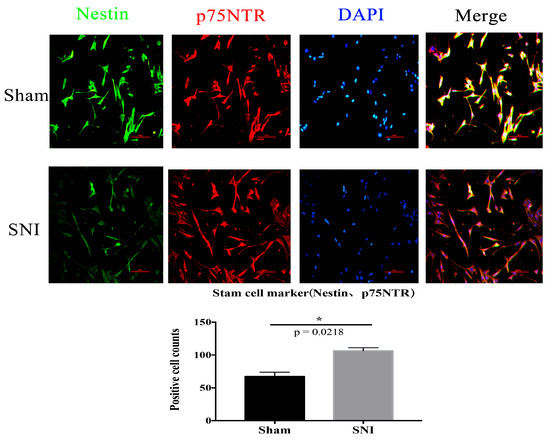 The co-labeling results of Nestin and p75NTR (Scale bar: 100 μm, 200×) (* p = 0.0218).