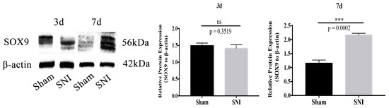 The results showed that mRNA expression of Sox9 in the SGCs injured group was upregulated compared to that in the Sham group at 3d and 7d (Figure 8). The protein expression of Sox9 in the SGCs injured group was upregulated compared to that in the Sham group at 7d (Figure 9). Collectively, these results suggest that mRNA and protein expression of Sox9 in SGCs were increased after SNI.