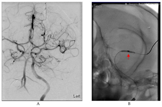 Digital subtraction angiography (DSA) images in the process of establishing the cynomolgus monkey stroke model. (A) Image of cerebral vascular anatomy in cynomolgus monkeys under DSA. (B) A balloon dilates in the M1 segment of the MCA as indicated by the red arrow.