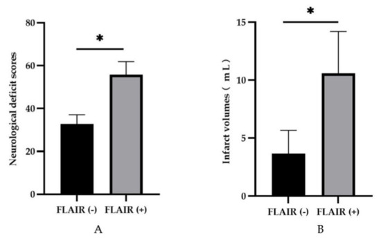 The FLAIR (−) group had lower neurological deficit scores and smaller infarct volumes than the FLAIR (+) group. * Presented p < 0.05. (A) The postoperative neurological deficit scores of the monkeys in each group 24 h after infarction. (B) The infarct volumes on DWI in each group.