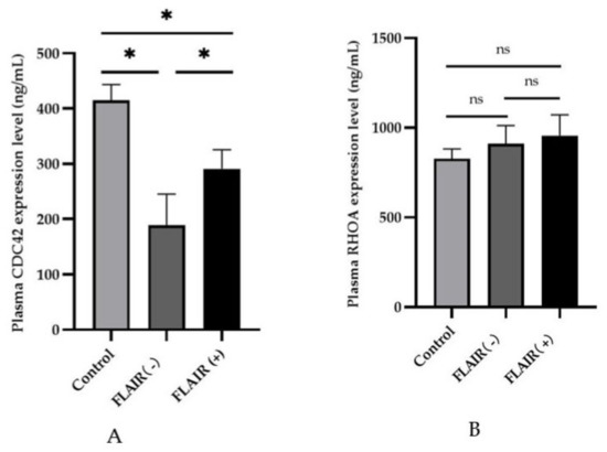 Plasma CDC42 and RHOA expression levels in the control, FLAIR (−), and FLAIR (+) groups. (A) Plasma CDC42 expression in each group. * Presented p < 0.05. (B) Plasma RHOA expression in each group. ns, p > 0.05.