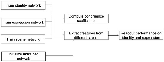 To test our two predictions, we studied whether features from hidden layers of a DCNN trained to recognize face identity (from here onward the “identity network”) could be used successfully to recognize facial expression (see [39] for a related analysis). Symmetrically, we evaluated whether features from hidden layers of a DCNN trained to recognize facial expression (the “expression network”) could be used to identify face identity. In line with our anticipated results, we found that in a DCNN trained to label one property (i.e., expression), the readout performance of the non-trained property (i.e., identity) was not just preserved, but improved, from layer to layer. This was in stark contrast with classical theories of abstraction in visual processing that suggest that information about task-orthogonal information is progressively discarded [40,41,42]. Finally, we investigated the relationship between features encoding information that distinguish between identities and expressions across different layers of the DCNNs. We demonstrated that identity-discriminating features and expression-discriminating features became increasingly orthogonal over the network layers.
