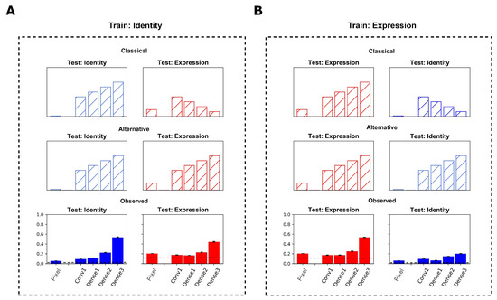 Identity and Expression Networks. (A) Identity Network. (Top row) Expected pattern of results following a classical view of abstraction. (Middle row) Expected pattern of results following an alternative view of abstraction. (Bottom row) Observed Results. Classification accuracy for identity (left) and expression (right) for a readout layer attached to successive sections of the pre-trained identity network. Dotted line represents performance at chance. Leftmost bar represents performance of the unattached linear classifier. (B) Expression Network. (Top row) Expected pattern of results following a classical view of abstraction. (Middle row) Expected pattern of results following an alternative view of abstraction. (Bottom row) Observed Results. Classification accuracy for expression (left) and identity (right) for a readout layer attached to successive sections of the pre-trained expression network. Dotted line represents performance at chance. Leftmost bar in each plot represents performance of the unattached linear classifier. Error bars denote the SEM of the performance of each network instance.