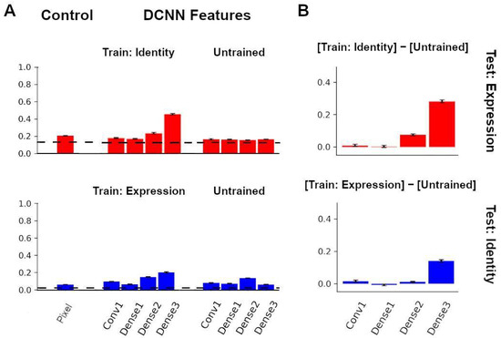Figure 5B shows the accuracy differences for expression and identity labeling when subtracting the untrained network performance from the trained network performance of the transferred task. Overall, the difference between the transferred task performance and the untrained performance increased from layer to layer, showing the relative advantage of the trained network.