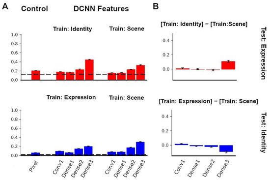 When labeling expression, features extracted from the initial convolutional layer and first, second, and third dense blocks of the scene network yielded accuracy values of , , , and , respectively (Figure 6A, top right). Although the scene network increased from layer to layer, it did not perform as well as the expression and identity networks for expression classification. The differences in accuracy between the identity and scene network for expression labeling can be seen in Figure 6B (top).