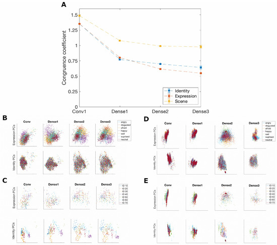 If the features that were most useful for labeling identity and expression were similar, the dimensions that best discriminated between identities and those that best discriminated between expressions should also be similar. Thus, the angles between identity dimensions and expression dimensions should be small and congruence should be high. If, on the other hand, features needed to recognize identity and expression were disentangled by the net, the angles between identity dimensions and expression dimensions should become increasingly larger from layer to layer. Furthermore, if training with identity or with expression induced disentanglement between identity and expression features, training the network with scene images should yield comparatively higher congruence between identity and expression features compared to training with identity or expression.