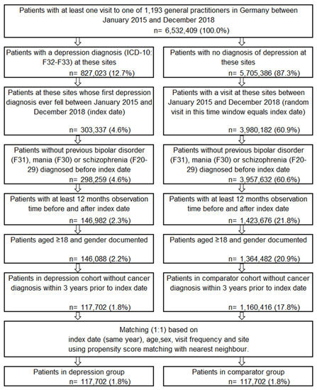 Patients were included in the cohort from the DA database if they had a physician visit within the inclusion window of January 2015 to December 2018, allowing for a follow-up period of at least 3 years per patient at time of data extraction in November 2021. Patients with depression were determined as patients with a first depression diagnosis (ICD-10 codes F32, F33) in this inclusion window, while the patients in the comparator group (CG) were chosen based on at least one visit within this time and no depression diagnosis at any point, respectively. The index date was determined as the first depression diagnosis in the 303,337 patients in the depression group (4.6% of patients included in the database), while the index date of the 3,980,182 patients (60.6% of patients included in the database) in the comparator group was a randomly selected visit which fell within the inclusion window. In both groups, any patients with a diagnosis of bipolar disorder (F31) or schizophrenia (F20–F29) before index date were excluded. Only patients with a minimum 1-year baseline and follow-up observation period, aged ≥ 18 years, and with gender documented were further selected. The resulting 117,702 patients with depression (1.8% included from the database) were matched 1:1 to patients from the comparator group using propensity score matching of nearest neighbors with a caliper of 0.2. The propensity score was based on index date (same year as patient in depression group), age, gender, visit frequency, and site. Visit frequency was included in the matching to remove any bias of chronically ill patients having more frequent physician visits and to equalize the detection rate of cancer between groups. This resulted in 117,702 patients with depression (1.8% included from the database) matched with 117, 702 patients in the comparator group (see Figure 1). Matching was based on propensity scores calculated from diagnosis year, age, gender, visit frequency (quarters per year with one visit), and site, with matched patients determined using 1:1 matching of nearest neighbors with a caliper of 0.2.