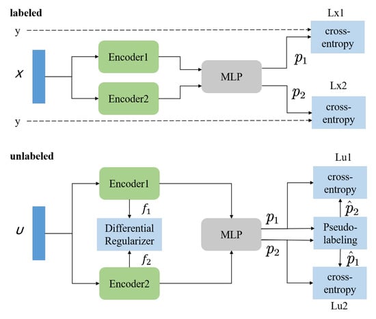 In this subsection, we introduce DSSL, a novel semi-supervised method, as a convenient and accurate classifier for the clinical diagnosis of AD. Inspired by fixMatch [], DSSL combines consistency regularization and pseudo-labeling, two SSL methods discussed in the previous section. Figure 1 shows the overall view of the model for the supervised and unsupervised parts. DSSL applies model perturbation through two different encoders. To make the two encoders learn as different features as possible, DSSL introduces difference regularization, which stretches the distance between the features extracted from the input by the two encoders. The network architecture of the encoders is shown in Figure 2. For a sample, two different feature vectors are obtained through Encoder1 and Encoder2, respectively. These two vectors are then fed into the multilayer perceptron (MLP) network to obtain two prediction results. They serve each other as pseudo-labels for the different prediction results, which constitutes consistency regularization. Algorithm 1 provides the complete DSSL algorithm.