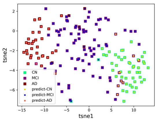 To compare the effect of different labeled sample sizes in the training set on the classification performance, our experiments are designed with two labeled sample sizes: 60 labeled and 120 labeled. It should be noted that the rest of the training data are unlabeled samples. In the proposed model, the test data achieved an accuracy of 85.47% with 60-label training and 88.40% with 120-label training. Figure 4 shows the prediction results for the test set samples, where the boxes indicate the actual labels of the samples and the dots indicate the prediction results of the samples by DSSL. T-distributed stochastic neighbor embedding (t-SNE) can reduce high-dimensional data to two or three dimensions for data visualization. As shown in the figure, most of the sample points predicted by DSSL fall correctly in the boxes of the authentic samples.