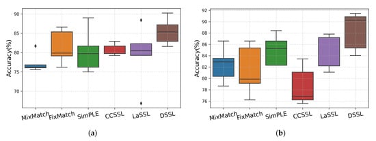 We compare our proposed method with other existing semi-supervised methods. The five methods described in Section 2: MixMatch [], FixMatch [], SimPLE [], CCSSL [], and LaSSL [] are considered as baseline methods. To fairly compare these methods, we reimplement them using the same deep learning framework (i.e., PyTorch) and model. Considering that the strong augmentation part of the baseline methods is only applicable to image data, we choose mixup [] as an alternative to RandAugment [] or CTAugment [] for data augmentation. Table 5 compares the performance of all baselines and DSSL. We compute the evaluation results for both cases with labeled samples of 60 and 120. All results are averaged for the 5-fold cross-validation. It can be seen that DSSL outperforms all baselines to a large extent, both in the 60-label and 120-label cases. Figure 5 illustrates box plots of the accuracy of the 5-fold cross-validation experiments for the cases of 60 and 120 labels, respectively.