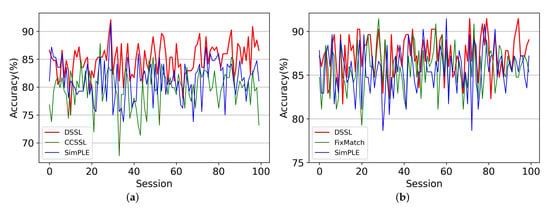 Although we achieve the best classification results in the 5-fold cross-validation experiments, the selection of different labeled data can seriously affect the classification performance for the SSL algorithm. We randomly select labeled samples from the training set and repeat this process 100 times to obtain 100 division results. We train these 100 divisions sequentially to observe the stability of the algorithm. The variance of the 100 times predictions for the DSSL and each baseline are shown in Table 6. For visualization purposes, we select the three models with the slightest variance in each of the two cases and plot their 100 times results as line graphs, as shown in Figure 6. It can be seen that the variance of DSSL is the lowest in both the 60-label and 120-label cases, which indicates that DSSL is more stable than the other baseline methods. In addition, the variance of the model with 120 labels is generally smaller than that of the case with 60 labels, suggesting that the increase in the number of labeled samples improves the stability of the SSL algorithm.