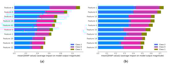 The confidence threshold seriously affects the quality of the generated pseudo-labels. Although we find the optimal value of in Table 3 through extensive experiments, this is time-consuming, and there is no guarantee that the set threshold will work for each data division. The question to be considered is how to weigh the number of unlabeled samples exceeding the threshold and the consistency rate of pseudo-labels with valid labels. Perhaps automatic learning of this parameter using neural networks would be a better approach. This is also how the model will be improved in the future. DSSL diagnoses AD by using two encoders to learn different features of the sample. To facilitate the visualization of the learned feature representations, we use Shapley values [] to quantify the importance of features in the algorithm predictions. We sort each feature in the feature representation by its contribution to the model output. Figure 7 shows the top 10 features with the highest contribution in each of the two feature representations, where class 2, 1, and 0 denote AD, MCI, and NC, respectively. As seen in the figure, all features have higher impact scores for AD and NC, while MCI as an intermediate stage is weakly influenced by these features. Moreover, the same features in the two feature representations do not contribute consistently to the algorithm output, which indicates that the two encoders in the proposed method do learn different feature representations. However, there are still limitations in the medical interpretation of these features in correlation with disease pathology. Using expert knowledge to correct the learned feature representation may yield better classification results.