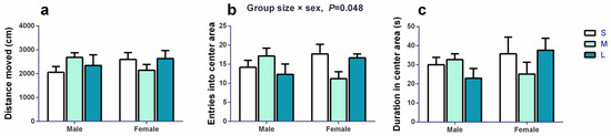 In the open field test, the distance moved (Figure 3a) was not significantly affected by group size (F2,11 = 0.183, p = 0.836), sex (F1,41 = 0.123, p = 0.728) or the interaction between them (F2,41 = 2.244, p = 0.119). The frequency of entering the center area (Figure 3b) was not significantly affected by group size (F2,56 = 0.410, p = 0.666) or sex (F1,56 = 0.109, p = 0.742), but it was significantly affected by the interaction between group size or sex (F2,56 = 3.198, p = 0.048). Duration in the center area (Figure 3c) was not significantly affected by group size (F2,6 = 0.208, p = 0.818), sex (F1,29 = 0.924, p = 0.345), or the interaction between group size and sex (F2,29 = 1.689, p = 0.202).