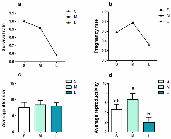 The survival rate and reproduction conditions on day 39–41. (a) Survival rate was not significantly affected by group size. n = 24 per group. (b) Pregnancy rate was not significantly affected by group size. n = 12 (S group), 9 (M group), and 12 (L group) per group. (c) The average litter size was not significantly affected by group size. n = 7 (S group), 7 (M group), and 3 (L group). (d) The average reproductivity was significantly affected by group size, and it was lower in the L group than that in the M group. n = 12 (S group), 9 (M group), and 12 (L group) per group. The average number of embryos and litters per pregnant female was defined as the average litter size. The average number of embryos and litters per female was defined as the average reproductivity per female. Survival rate and pregnancy rate were analyzed using a general linear mixed model (GLMM) with cage ID as a random factor. Average litter size and average reproductivity were analyzed by LMM. Cage ID was defined as random factor. S, M, and L are small group, medium group, and large group, respectively. Bars indicate mean ± SEM. Bars with different letters differ significantly from each other.