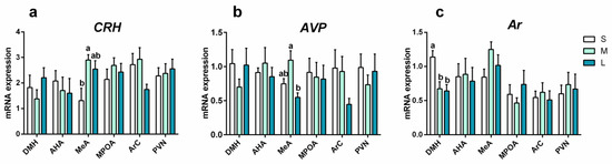 Group size affected neurochemical mRNA expression in the brain of male Brandt’s voles in a brain-region-specific manner. mRNA expression for (a) corticotrophin-releasing hormone (CRH), (b) arginine vasopressin (AVP), (c) androgen receptor (Ar). Linear mixed model (LMM) analysis was performed. Cage ID was defined as random factor. n = 7 (S group), 6 (M group), and 6 (L group) per group. S, M, and L are small group, medium group, and large group, respectively. Bars indicate mean ± SEM. Bars with different letters differ significantly from each other.