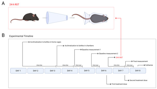 At 20:00 on day 6, all mice were injected with their first of 2 treatments before a subset of these mice entered the 24 h RST (Figure 1A,B). The aim of this first treatment was to pharmacologically interfere with and prevent the stress response. Each mouse also received a 200 µL subcutaneous injection of Lactated Ringer’s solution for hydration ahead of the 24 h RST. Mice were restrained using a DecapiCone (Braintree, Chicago, IL, USA, Cat # NC9679094) (Figure 1B) [13], and then each was placed in a clean, sanitized, and empty SPT chamber for the next 24 h (Figure 1A). Figure 1B illustrates the 24 h RST apparatus and protocol, which was adapted from that of Chu et al. (2016) [12]. During this prolonged restraint period, mice were monitored every 6 h. At 09:00 on day 8, mice were released from the restraint, injected with their second treatment, and then placed in the SPT containing a paper towel and the refilled, weighed bottles (Figure 1A). The aim of this second treatment was to maintain drug levels in the animal’s system for the entire duration of the test. The final preference measurement then occurred over 12 h (Figure 1A). At 09:00 on day 8, all bottles were weighed, and mice were removed from their chambers (Figure 1). Mice were euthanized before 12:00 that same day (Figure 1A). This 8-day experimental timeline was designed to resemble that of (Figure 1A) [47].