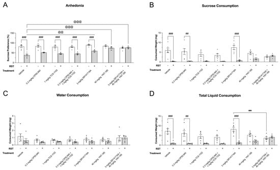 The sucrose preference data was parsed into raw sucrose, water, and total liquid consumption to visualize hedonic feeding behaviour (Figure 2B–D). Congruent with the data presented in Figure 2A, the prolonged restraint stress decreased sucrose consumption within the vehicle (p < 0.001), 0.3 mg/kg CP55,940 (p < 0.01), and 3 mg/kg SR141716A groups (p < 0.001) treatment groups (Figure 2B). Mice that received 1 mg/kg TCS-1102, 0.3 mg/kg CP55,940 + 1 mg/kg TCS-1102, and 40 mg/kg YNT-185 displayed a similar trend; however, these differences were not statistically significant (p > 0.05) (Figure 2B). With regards to raw water consumption, there were no significant differences between non-24 h RST and 24 h RST groups, nor were there differences between the drug treatments within non-restraint stressed or prolonged restraint stress groups (p > 0.05) (Figure 2C). Again, 24 h RST reduced the sum of sucrose and water (total liquid) consumption in the vehicle (p < 0.001), 0.3 mg/kg CP55,940 (p < 0.01), and 3 mg/kg SR141716A-treated mice (p < 0.001) (Figure 2D). Moreover, non-restraint mice injected with 3 mg/kg SR141716A exhibited higher liquid consumption compared to their combination drug-treated counterparts (p < 0.01) (Figure 2D). The lack of group differences in Figure 2C supports the notion that total liquid consumption is driven by sucrose preference over water (Figure 2).