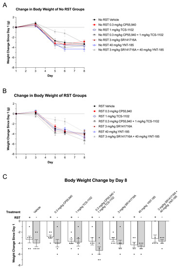Change in body weight of cannabinoid and orexin drug-treated mice throughout the SPT and 24 h RST. (A) Daily change in body weight since day 1 of No 24 h RST groups. (B) Daily change in body weight since day 1 of RST groups. (C) Body weight change between days 1–8 of all drug and stress treatment groups. (A–C) The body weights of adult male and female C57BL/6 mice treated with either 200 µL of vehicle, 0.3 mg/kg CP55,940 (cannabinoid receptor agonist), 1 mg/kg TCS-1102 (DORA), 0.3 mg/kg CP55,940 + 1 mg/kg TCS-1102, 3 mg/kg SR141716A (CB1R antagonist), 40 mg/kg YNT-185 (OX2R agonist), and 3 mg/kg SR141716A + 40 mg/kg YNT-185 were measured in the morning of days 1, 3, 5, 6, and 8. Each day’s body weight was compared to that of day 1. Change in body weight is expressed as (g). n = 6 mice (n = 3 males; n = 3 females) as each experimental group is reported as a mean ± SEM. Statistical significance for graphs A and B was assessed by a two-way ANOVA followed by a Tukey’s post-hoc analysis with repeated measurements within groups between days and across groups within days. Significant differences within panel C were evaluated via Tukey’s post-hoc analysis without repeated measures. In the figure above “+” refers to with RST and “−“ refers to without RST.