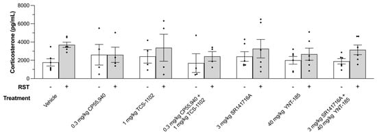 The effect of cannabinoid and orexin drugs on plasma corticosterone levels of mice that underwent the SPT and 24 h RST. After the final sucrose preference measurement on day 8, adult male and female C57BL/6 mice were euthanized, and their blood was collected for quantification of the circulating corticosterone using an ELISA kit. Data from 200 µL vehicle, 0.3 mg/kg CP55,940 (cannabinoid receptor agonist), 1 mg/kg TCS-1102 (DORA), 0.3 mg/kg CP55, 940 + 1 mg/kg TCS-1102, 3 mg/kg SR141716A (CB1R antagonist), 40 mg/kg YNT-185 (OX2R agonist), and 3 mg/kg SR141716A + 40 mg/kg YNT-185-treated mice are expressed as pg/mL. n = 6 mice (n = 3 males, n = 3 females) for Vehicle, 3 mg/kg SR141716A, 40 mg/kg YNT-185, and 3 mg/kg SR141716A + 40 mg/kg YNT-185 treatment groups. n = 4 mice (n = 2 males, n = 2 females) for 0.3 mg/kg CP55,940, 1 mg/kg TCS-1102, 0.3 mg/kg CP55,940 + 1 mg/kg TCS-1102 treatment groups. Means ± SEMs were used to evaluate statistical significance by a two-way ANOVA followed by a Tukey’s post-hoc analysis. In the figure above “+” refers to with RST and “−“ refers to without RST.