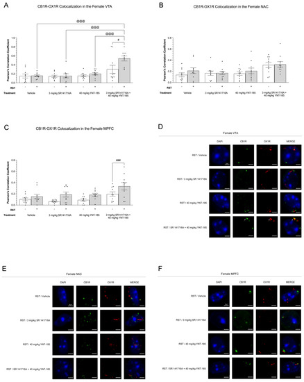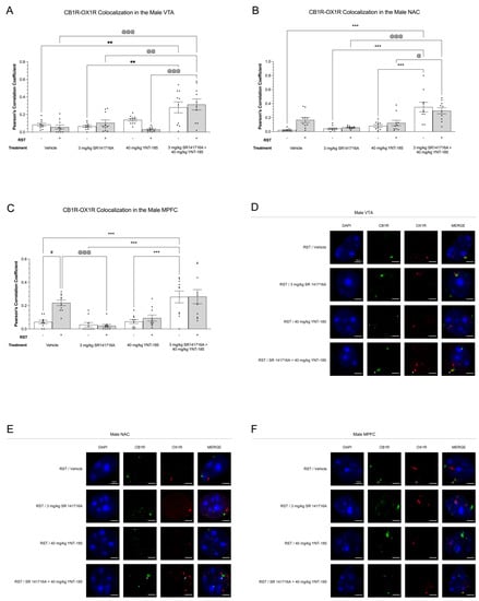 Receptor colocalization measures the physical closeness or proximity of receptor proteins in a two-dimensional frame. Colocalization may therefore be indicative of potential interactions between receptors but does not provide direct evidence of heterodimerization [50]. In the current study, prolonged restraint stress along with drug treatments altered cannabinoid and orexin receptor colocalization levels within mesocorticolimbic regions involved in hedonic feeding [51]. Based on the SPT results (Figure 2), CB1R-OX1R/OX2R colocalization was quantified in the VTA, NAC, and MPFC of the vehicle, 3 mg/kg SR141716A, 40 mg/kg YNT-185, and 3 mg/kg SR141716A + 40 mg/kg YNT-185-treated male and female mice (Figure 5, Figure 6, Figure 7 and Figure 8). In the VTA of male mice, 3 mg/kg SR141716A + 40 mg/kg YNT-185 led to greater CB1R-OX1R colocalization as compared to 3 mg/kg SR141716A and vehicle treatments in non-restraint samples (p < 0.01) (Figure 5A). Within the 24 h RST groups, the combination of 3 mg/kg SR141716A + 40 mg/kg YNT-185 resulted in the most CB1R-OX1R colocalization amongst all other drug treatments (p < 0.01–0.001) (Figure 5A). Similarly, in the male NAC, 3 mg/kg SR141716A + 40 mg/kg YNT-185 increased CB1R-OX1R colocalization relative to 40 mg/kg YNT-185, 3 mg/kg SR141716A, and vehicle-treated samples amongst the non-24 h RST groups (p < 0.001) (Figure 5B). Within the 24 h RST groups, 3 mg/kg SR141716A + 40 mg/kg YNT-185 led to greater CB1R-OX1R colocalization compared to samples treated with 40 mg/kg YNT-185 (p < 0.05) and 3 mg/kg SR141716A (p < 0.001) (Figure 5B). The MPFC of males showed a different trend wherein 3 mg/kg SR141716A + 40 mg/kg YNT-185 resulted in the highest degree of CB1R-OX1R colocalization in only the non-restraint samples (p < 0.001) (Figure 5C). Amongst the 24 h RST groups, vehicle-induced CB1R-OX1R colocalization was larger than that of 3 mg/kg SR141716A (p < 0.001) (Figure 5C). Also, within the vehicle group, 24 h RST increased CB1R-OX1R colocalization (p < 0.05) (Figure 5C). Representative images of CB1R-OX1R colocalization in the male VTA, NAC, and MPFC of 24 h RST groups are presented in Figure 5D–F; representative images from No-RST groups are presented in Supplemental Figure S1. These colocalization results serve as evidence for receptors existing near each other within the same cells but do not prove that the receptor proteins are physically nor functionally interacting on the plasma membrane.