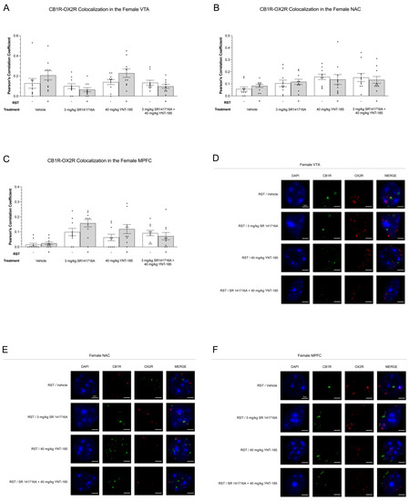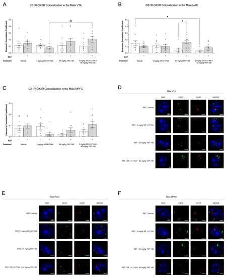 Colocalization analysis was also done for CB1R and OX2R. In the VTA of males subjected to 24 h RST, the combination drug treatment of 3 mg/kg SR141716A + 40 mg/kg YNT-185 increased CB1R-OX2R colocalization as compared to 3 mg/kg SR141716A (p < 0.05) (Figure 6A). In the NAC of non-restraint groups, the CB1R-OX2R colocalization of vehicle samples was higher than that of 3 mg/kg SR141716A + 40 mg/kg YNT-185 (Figure 6B). Prolonged restraint stress also increased CB1R-OX2R colocalization in the male NAC of 40 mg/kg YNT-185-treated samples (p < 0.05) (Figure 6B). No differences were detected between experimental groups in the MPFC (p > 0.05) (Figure 6C). Representative images of CB1R-OX2R colocalization throughout these mesocorticolimbic brain regions are shown in Figure 6D–F; representative images from No-RST groups are presented in Supplemental Figure S2.