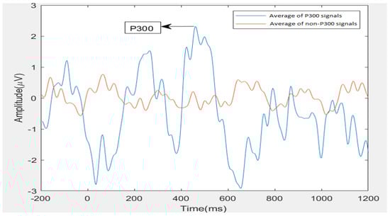 A recent study by Jitender Sorout et al. [25] to access the normative data of the P300 amplitude and latency on hundred healthy individuals in the age group of (18–25) years with a mean age of years revealed that the mean P300 latency and amplitude were ms and μV, respectively. Figure 1 shows the grand average of P300 and non-P300 signal amplitudes from the Pz channel for an individual with ASD in the dataset considered in this research work. Here from −200 ms to 0 ms is the pre-stimulus interval, and the stimulus is onset at 0 ms.
