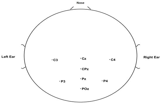 The EEG data were recorded using g.Nautilus (gTEC, Austria) wireless equipment from eight central and parietal electrodes C3, Cz, C4, CPz, P3, Pz, P4, and POz. The ground electrode was placed at the AFz electrode position and the reference electrode at the right ear. The top view of the EEG electrode layout in accordance with the international 10–20 system of the electrode placement is shown in Figure 2. The EEG sampling frequency is 250 Hz.
